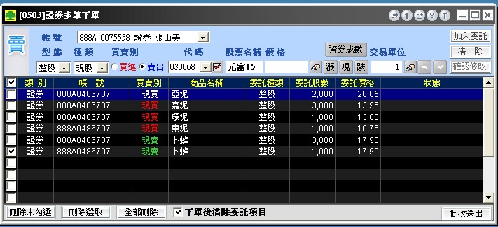| (3)按下加入委託鈕,即列入下方之下單匣中暫存。 |